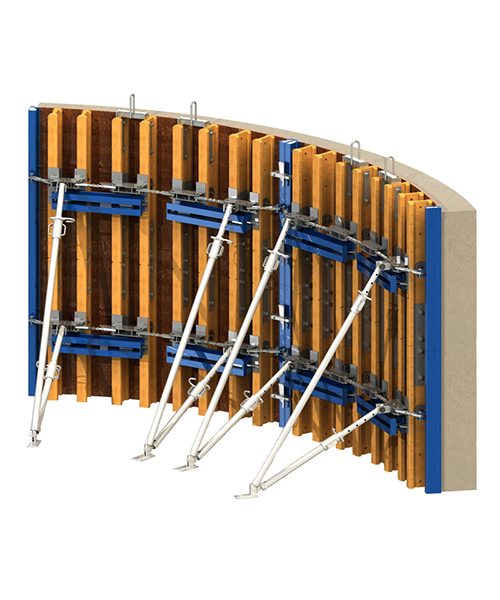 The circular formwork RINGFORM by Variant is a practical system for forming of smooth and curved walls. Only 6 types of elements are used: 3 sizes in height 1.2/2.4/3.0 m and 2 widths, 2.4 m for inner part of the wall and 2.5 m for outer. The required radius is easily achieved by using adjustable spindles.